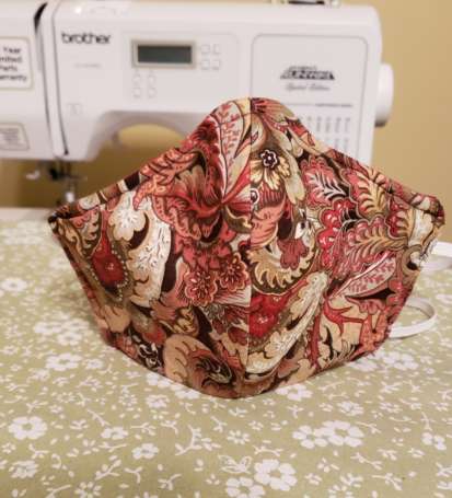 The mask is made with 100% cotton and has a non-woven fusible interfacing as the filter. The mask can be shaped at the nose bridge to conform to your face. All masks will have a print or color in the front and a white or black inner layer. The mask is re-usable and should be washed and dried regularly.